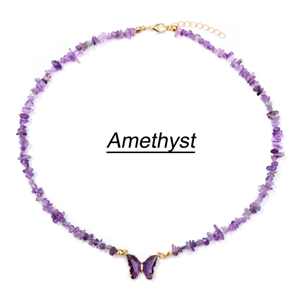 Collier améthyste femme de perles en pierre et pendentif papillon