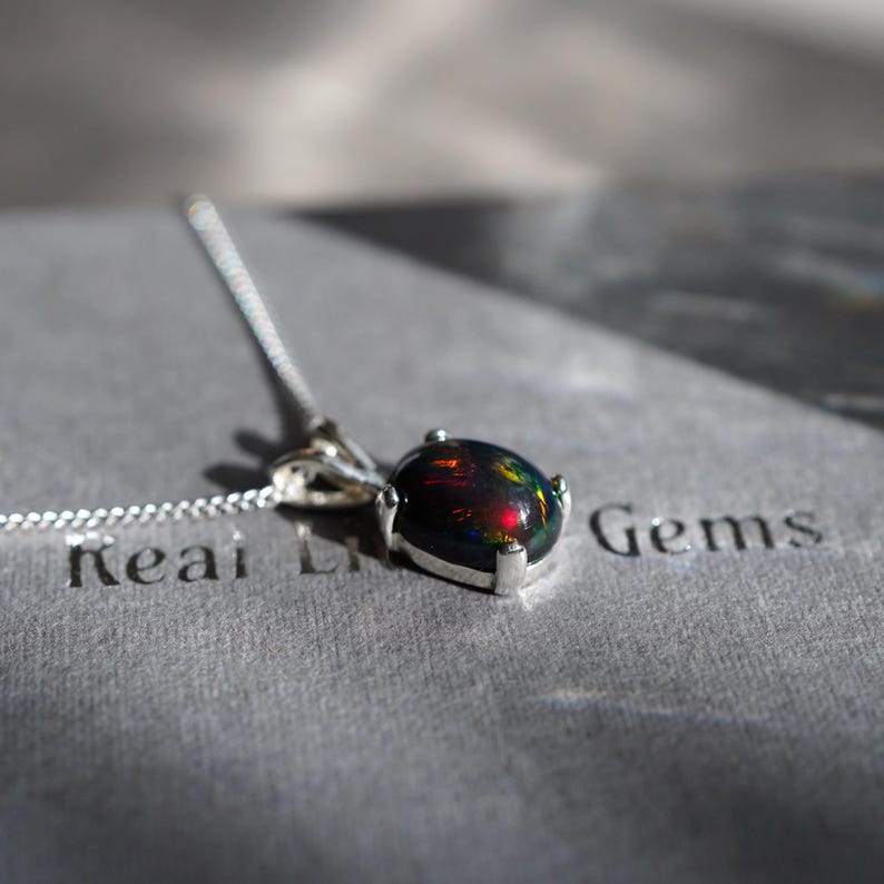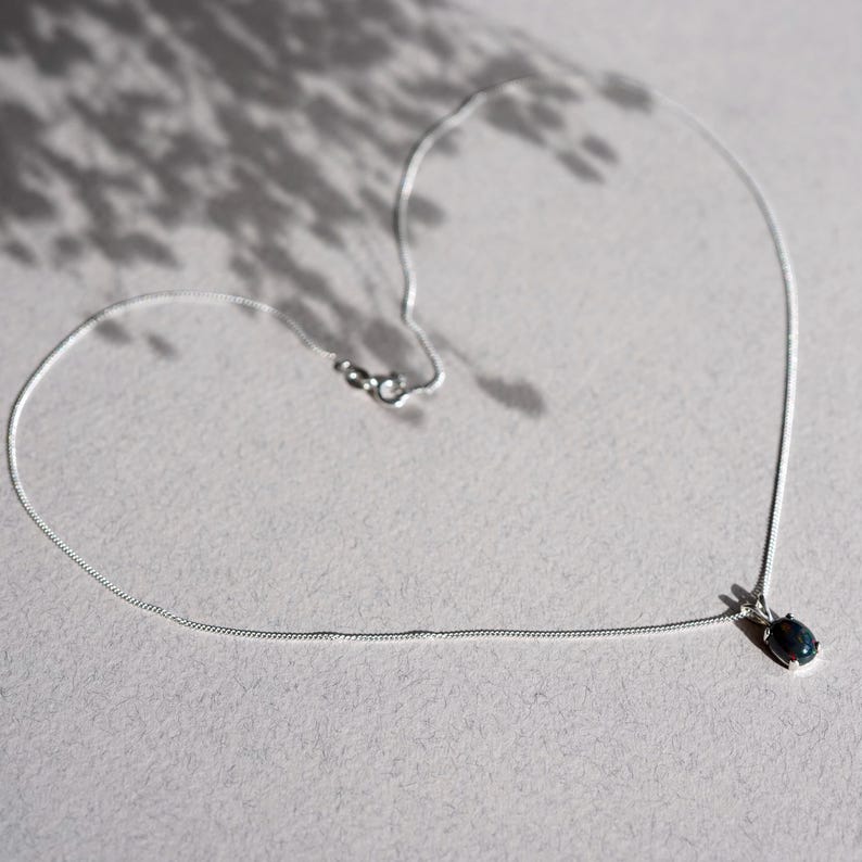 Ce pendentif est réalisé en argent sterling 925 et serti d’une opale éthiopienne naturelle, entière (ni doublet ni triplet). La pierre, fumée ou teintée pour obtenir sa teinte sombre, conserve ses caractéristiques naturelles, ce qui rend chaque pendentif unique.